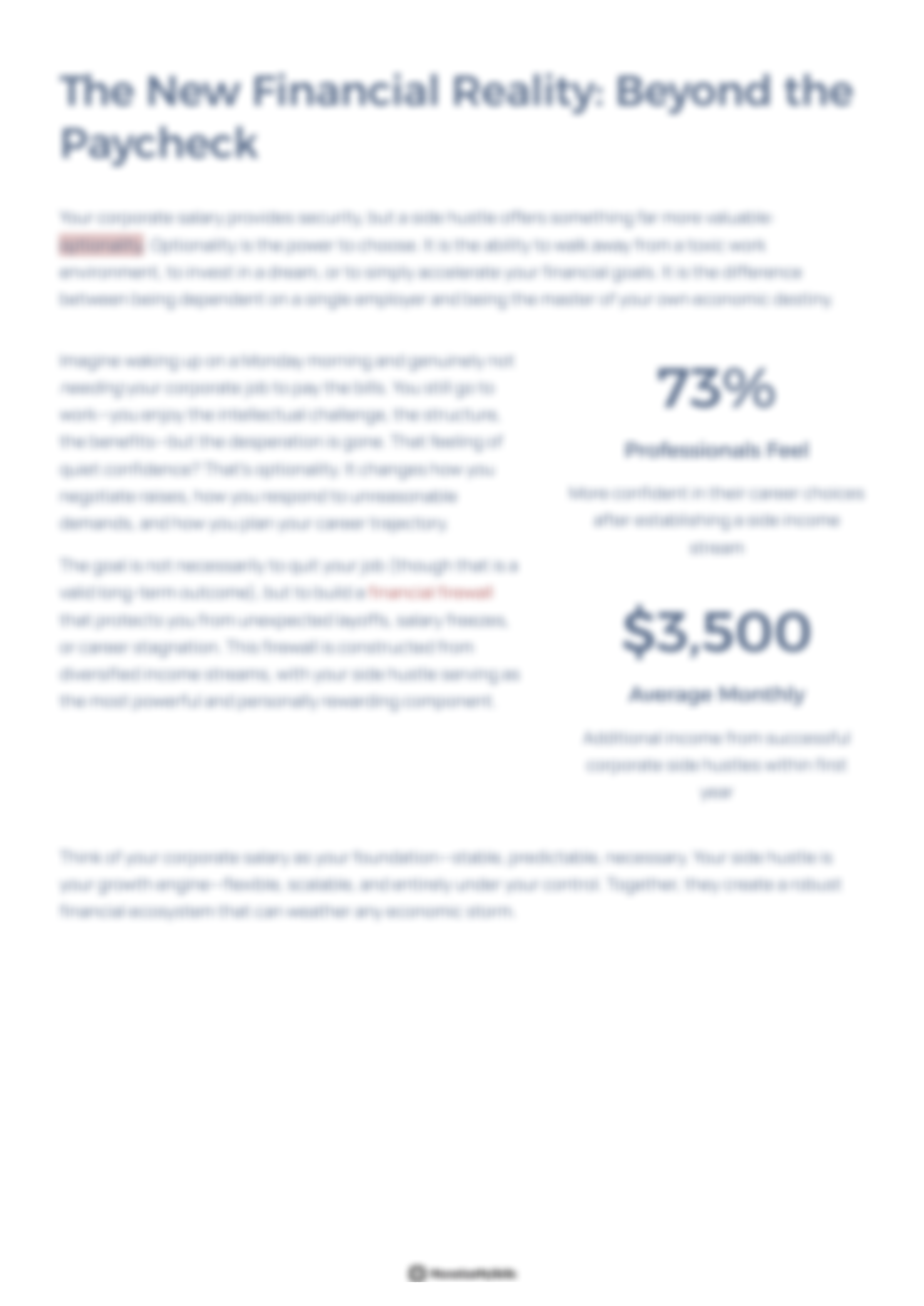 This comprehensive ebook is your step-by-step roadmap to building a $50,000+ side income stream—without sacrificing your day job, transforming your corporate expertise into optionality, security into freedom, and experience into wealth.