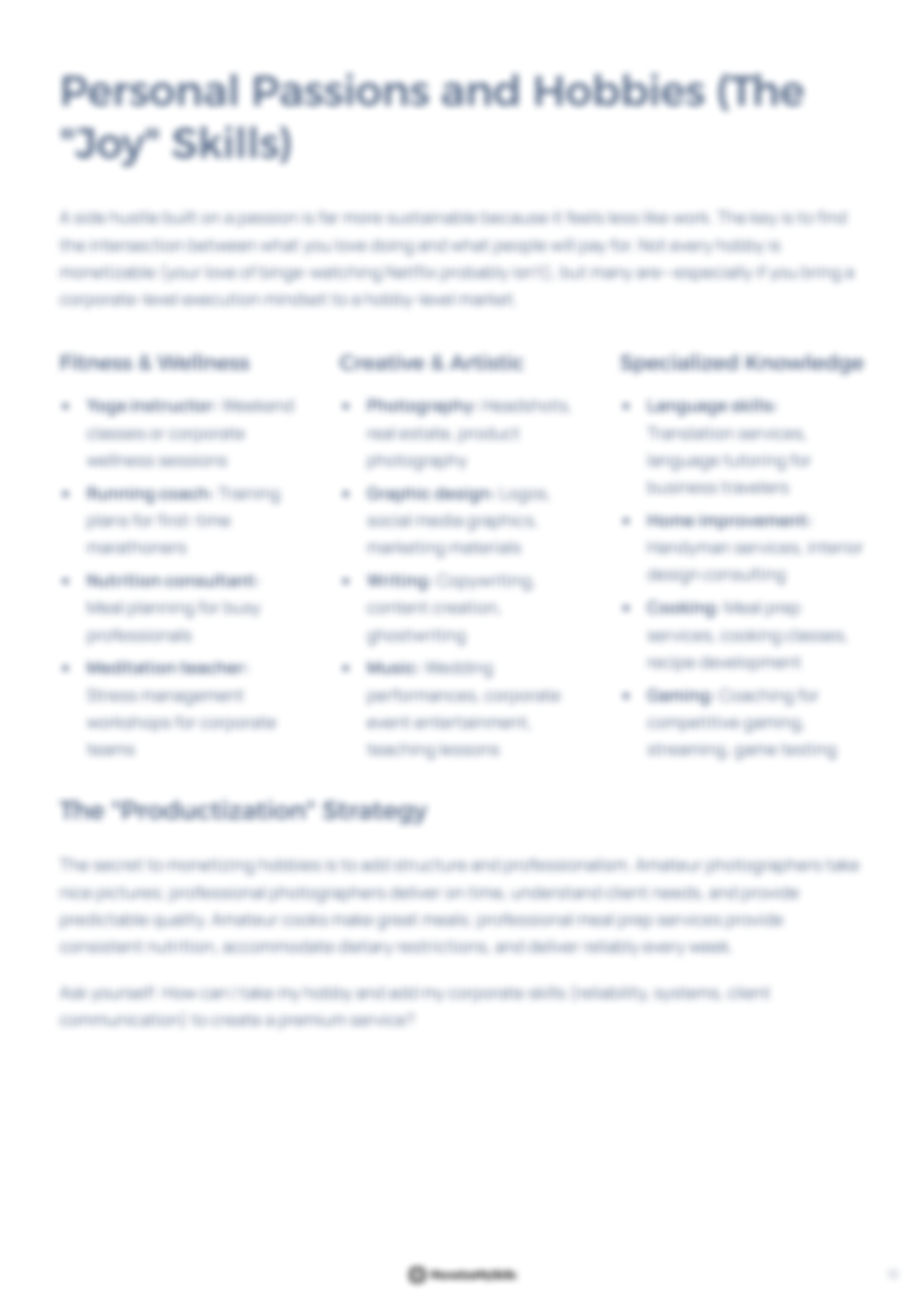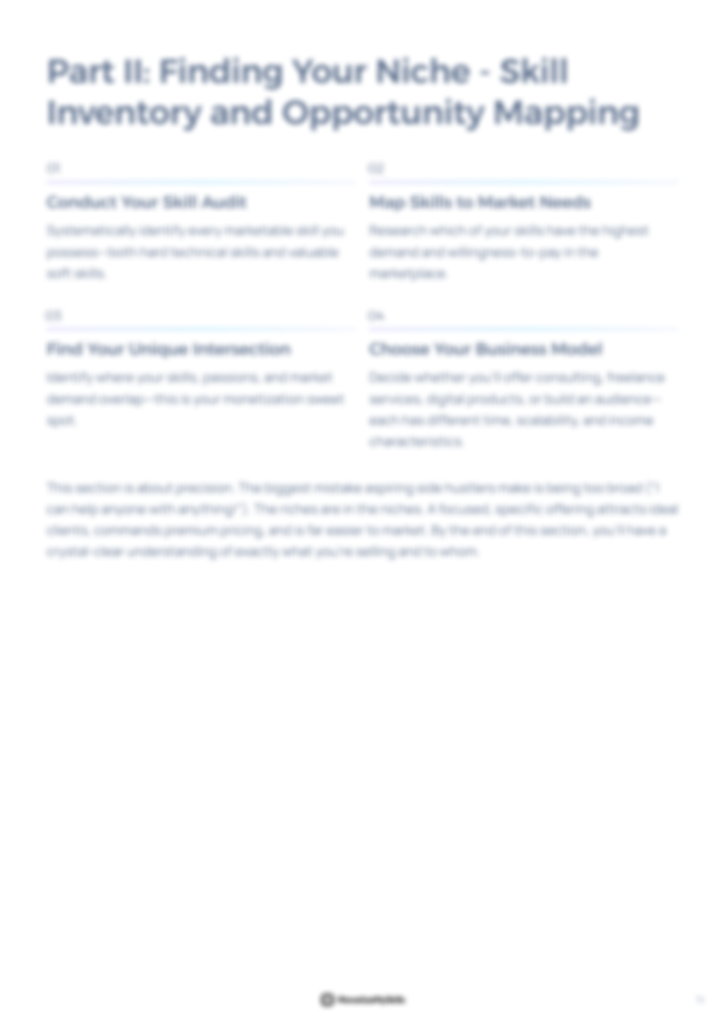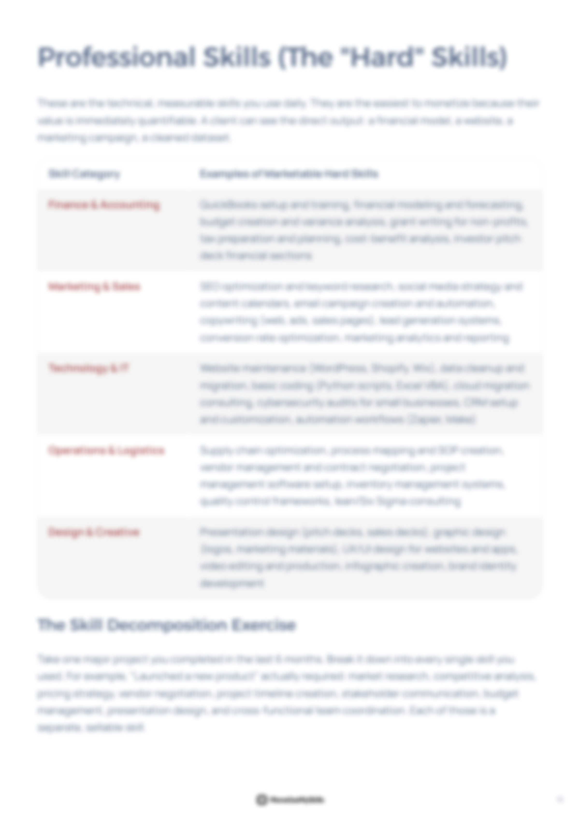 Complete the comprehensive Skill Audit covering professional hard skills, valuable soft skills, and passion-based joy skills. Discover the intersection where your expertise, enjoyment, and market demand meet—your unique monetization sweet spot. Learn the 4 Pillars of Skill Monetization: Consulting & Coaching, Service-Based Freelancing, Digital Products, and Content & Audience Building.