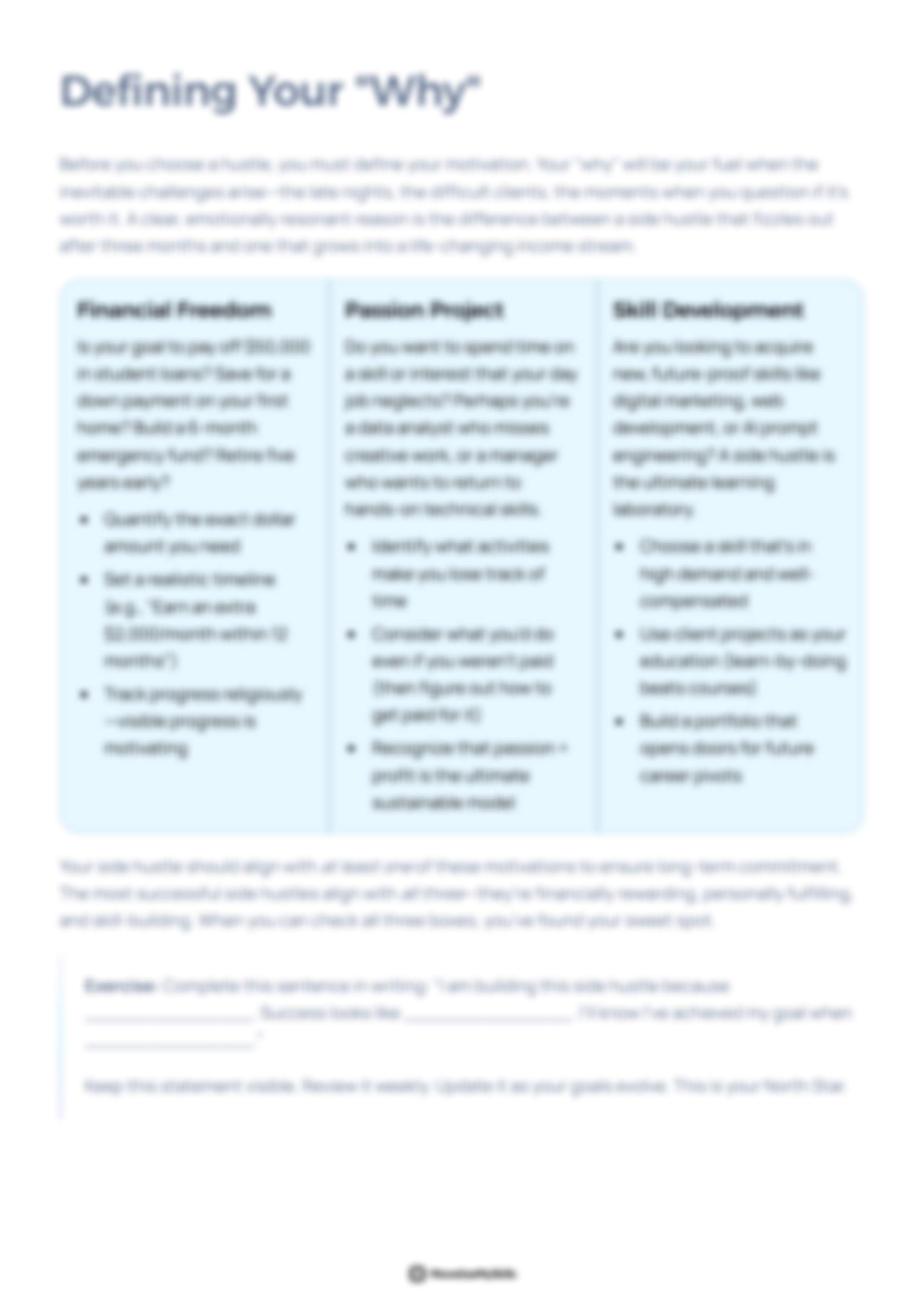 Why the traditional career path is no longer sufficient and how a side hustle provides the optionality you need. Overcome the corporate employee mindset, recognize your hidden value, and define your compelling "why" that will fuel you through challenges.