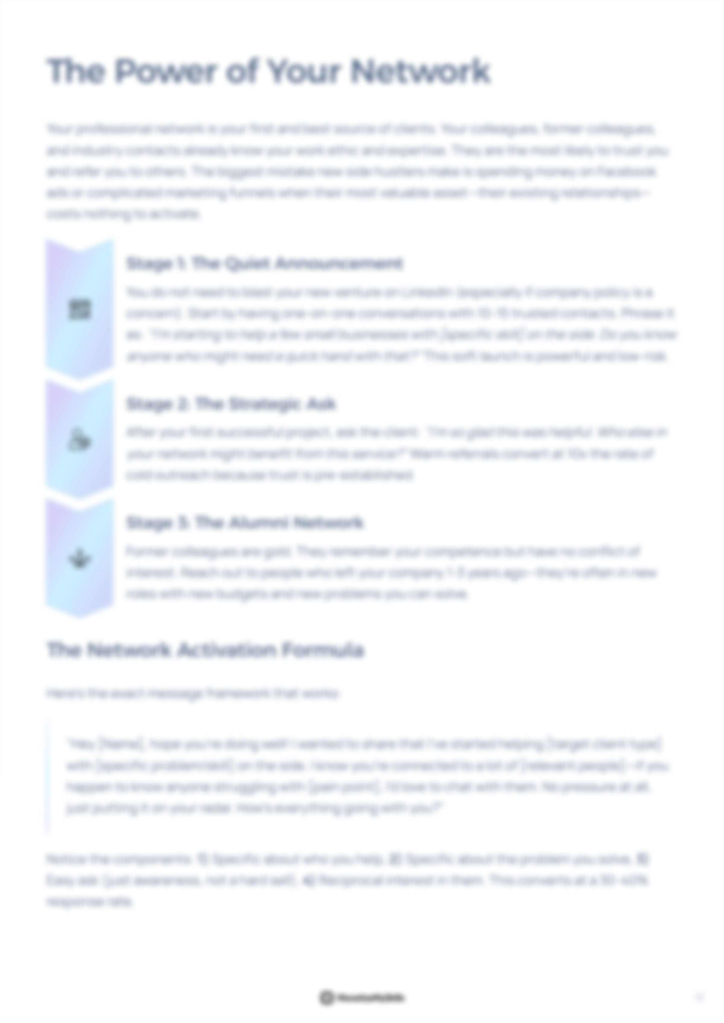 Master quick validation methods to test your idea before investing time. Define your Ideal Client Profile with precision. Craft your Minimum Viable Offer (MVO)—the simplest, highest-value service you can sell today. Implement value-based pricing strategies. Learn the time-blocking method to fit 5-10 focused hours per week into your schedule. Market your side hustle professionally through LinkedIn strategy and network activation.